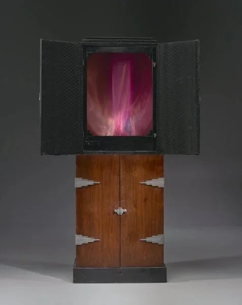 There are obvious formal similarities between Unsupervised and the Lumia series. Like Anadol’s work, Wilfrid’s compositions are boxed-up mechanisms that produce a stream of abstract images on a screen (though the inner workings of these pieces are orders of magnitude “simpler” than the black box systems Anadol traffics in). More significantly, the Lumia “Opuses,” as Wilfrid liked to call them, also responded to the techno-cultural milieu of their day. In the 1800s, the double slit experiment discovered that light behaves as both a wave and a particle, ushering us into an indeterminate quantum world. Then, in the early 20th Century, Einstein demonstrated that within this world of flux, lightspeed was a universal constant; this, however, required us to reimagine the empty and discrete container of space as a unified field of “spacetime.” Astronomical imagery of bent starlight further nuanced this picture by indicating that spacetime wasn’t a static Euclidean form, but a dynamically curving topology. By working with light, Wilfrid engaged with the medium around which our entire understanding of the cosmos was reorienting.