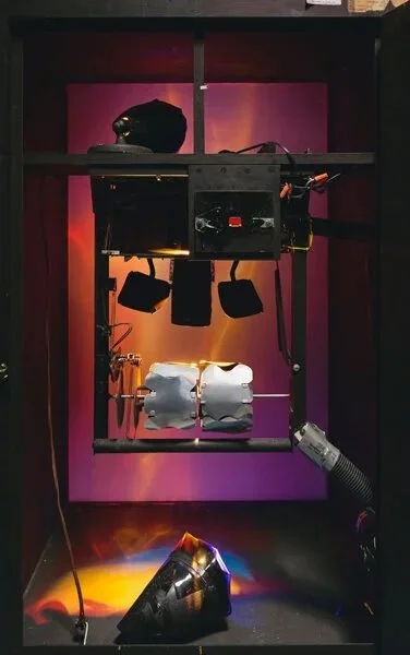 The exhibit took place in a darkened room populated by a series of what looked like midcentury TV boxes and projection screens of varying sizes. Undergirding each was a mechanical complex of lighting instruments, reflective panels, and glass panes that produced a show of prismatic light slow dancing across the surface. Portals into a world of light. These diaphanous spectra floated in a suspension of viscous darkness, immediately recalling the northern lights or distant nebulae rippling and arcing across the firmament. Placquards indicated the runtime of each “composition.” Some ran for minutes, while others went for years up to the limit of eternity.