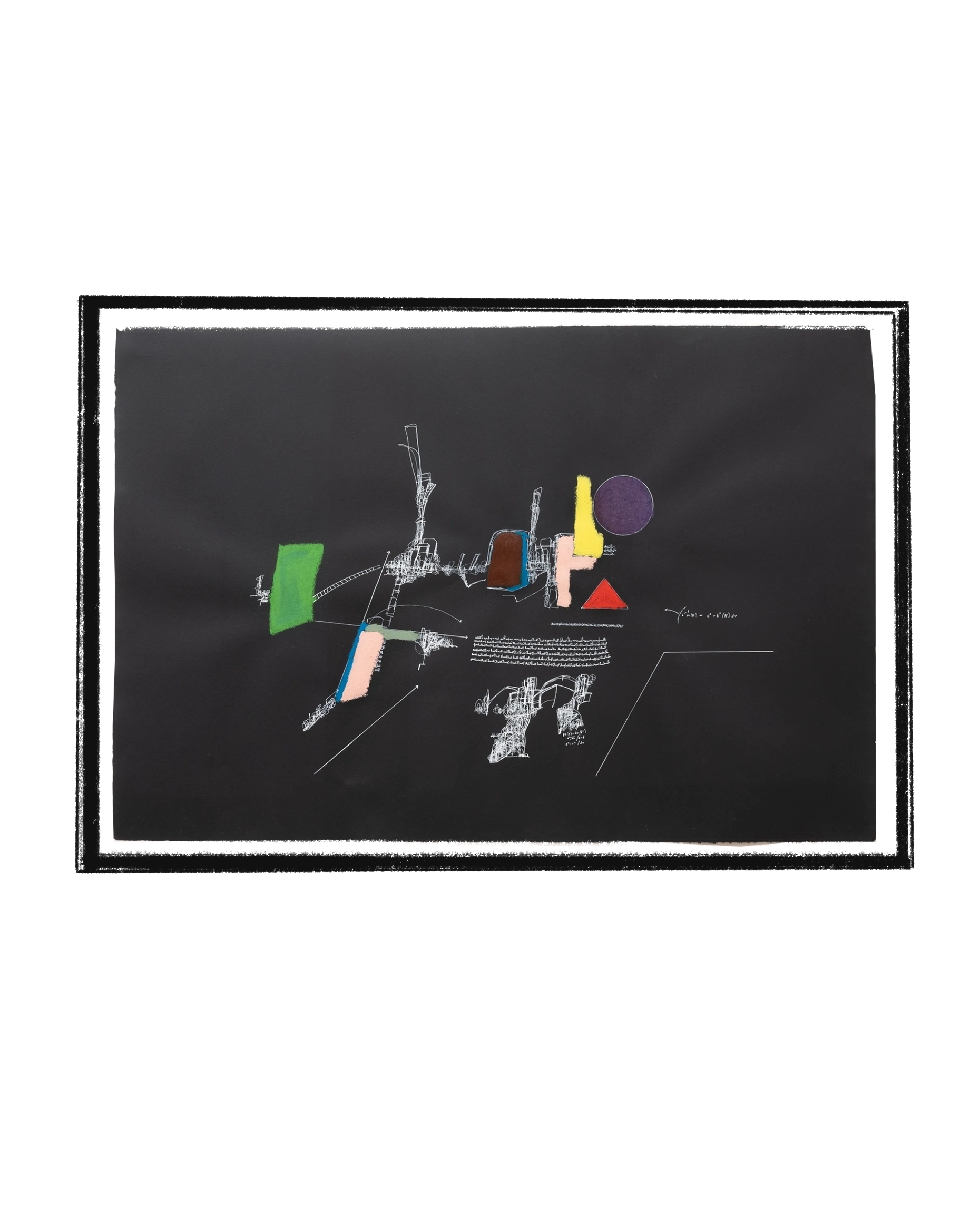 For instance, when viewing Untitled (Moon Math) (2022), the eye scans across the drawing's surface in a curious way. First, it attempts to read the textured expanse of asemic writing that covers two-thirds of the drawing's surface, like a rug with rents and stains. Then, circular forms, some transparent and some opaque, interrupt the mass of text, which, despite its disorderliness, is neatly justified left and right. One peers around the text, as if peering around the corner of a hallway, to discover a frenzy of activity: faux-equations and vectors float in an ether of wild, loopy scribbles, giving this part of Untitled (Moon Math) the appearance of a scratched chalkboard. The eye follows arched arrows around a central void. Beneath the void, mathematical expressions crammed into microscopic script appear to describe something vital: x squared over the square root of c times d squared over q minus q. What do these unknowns represent? The hypothetical critic-comptroller mimics a mathematician on the verge of a breakthrough, only to realize that what the expressions describe is not a tangible shape but the shape of “not-knowing.”