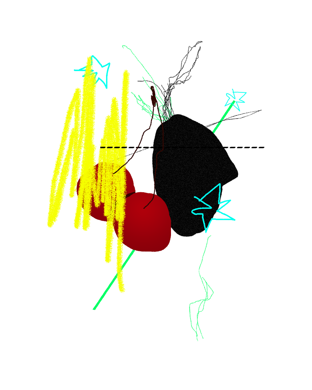 As a result, the “what” I get—and which I get I’m, perhaps, not supposed to get fully—is “like the underside of an apartment: all.” That totality is one of understory, a foundation made sensual and candid and complete. The obliquity flies into a bracing image (“a clipped little wing”) and the arrow on the dashed line shoots me back, toward that nebulous, wobbly mass in the bottom left. I see that mass more distinctly because its representation is missing from the audio. Thus, the poem’s text and performance, for me, end up emphasizing a non-lingual graphic element, an effect that happens variously through Hofmann’s collection, with its fractured and frank engagement with queer identity and experience, health, and personhood among economic and political distress, “in a world where cherries existed and i got to eat them.”
