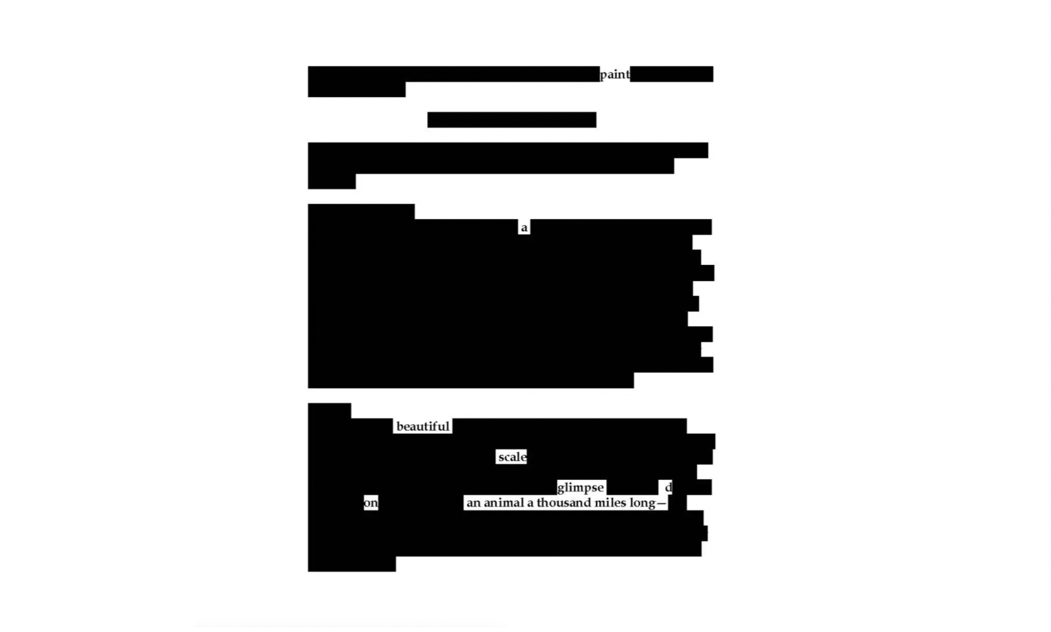 It's not a far leap, from Houle’s varied compositions, to think that any painting could serve as a graphic score, for the right performer. From there, one might wonder if any image—anything seen—could be one, too. If so, the visual configuration of any poem on a page could be seen with the suggestion of underlying orchestration, a music not in the language but in how it plays in the eye. That might be especially clear in works of erasure such as Sarah Kortemeier’s collection in the series, Aristotle’s Poetics, which extracts stepping-stone phrases from Aristotle’s text. As in the image below, the visual configuration has a performative, rhetorical effect; here we trickle from “paint” to pool at the horizon of “an animal a thousand miles long”: