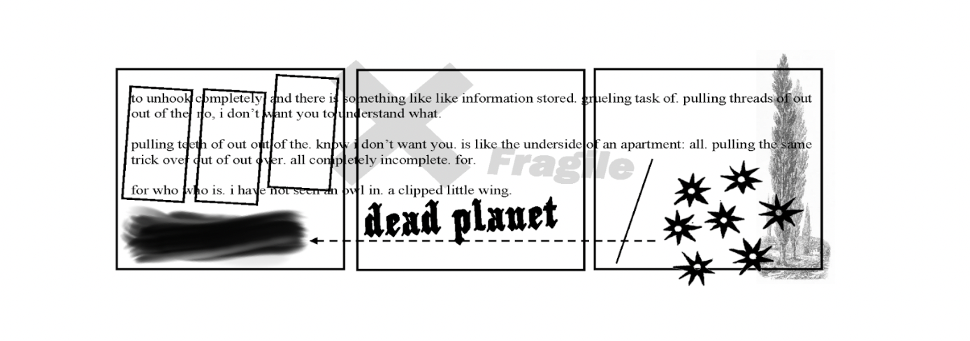 In the audio of the piece available at The Offending Adam, a flat bell clangs at intervals that are regular yet halting. There’s ambient crackling. The poem is performed left-to-right, without noticeable regard for the panel breaks; it runs through the gutters. Among the plain (but panged) delivery, “fragile” enters in a whisper, and “dead planet” is spoken in a voice that fits its font: half-heavy metal DJ, half-keyboard effect. Most of the non-lingual elements, such as the rubbery blur in the bottom left, aren’t rendered directly, although there’s a set of cat-like chirps at the end, corresponding to the array of jagged blossoms at the bottom right. The hush of “fragile” adds some metacommentary, folding through Hofmann’s language, which is already folding back on itself, even as it surges forward: “and there is something like like information stored,” Hofmann writes, and I feel held in the glitch of “like like.” Figurative language often clarifies meaning, but “like like” defies simile, emphasizing that, as Hofmann writes, “I don’t want you to understand what.”